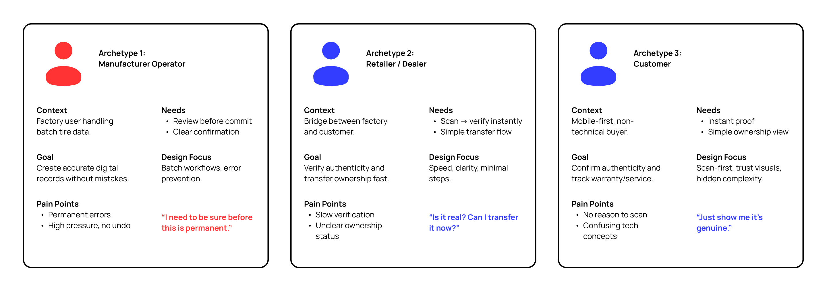 I found that tire data is currently scattered across paper warranties and siloed databases. This makes it impossible for customers to verify if a tire is genuine. During my discovery phase, I identified two major pain points.